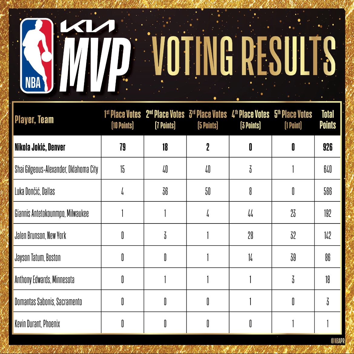Jalen Brunson finishes fifth in the MVP voting. Earned three second-place votes and one third. – 7:46 PM